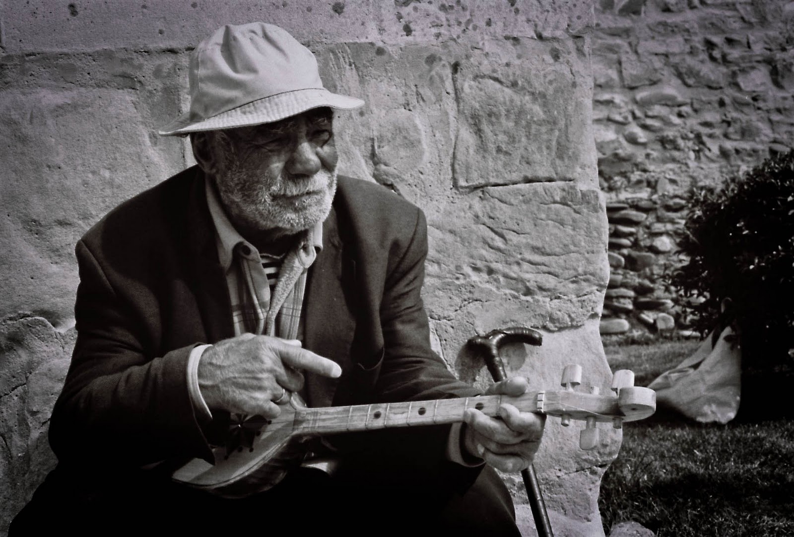 | An old man plays and sings for pilgrims and tourists in Mtskheta, Georgia |
